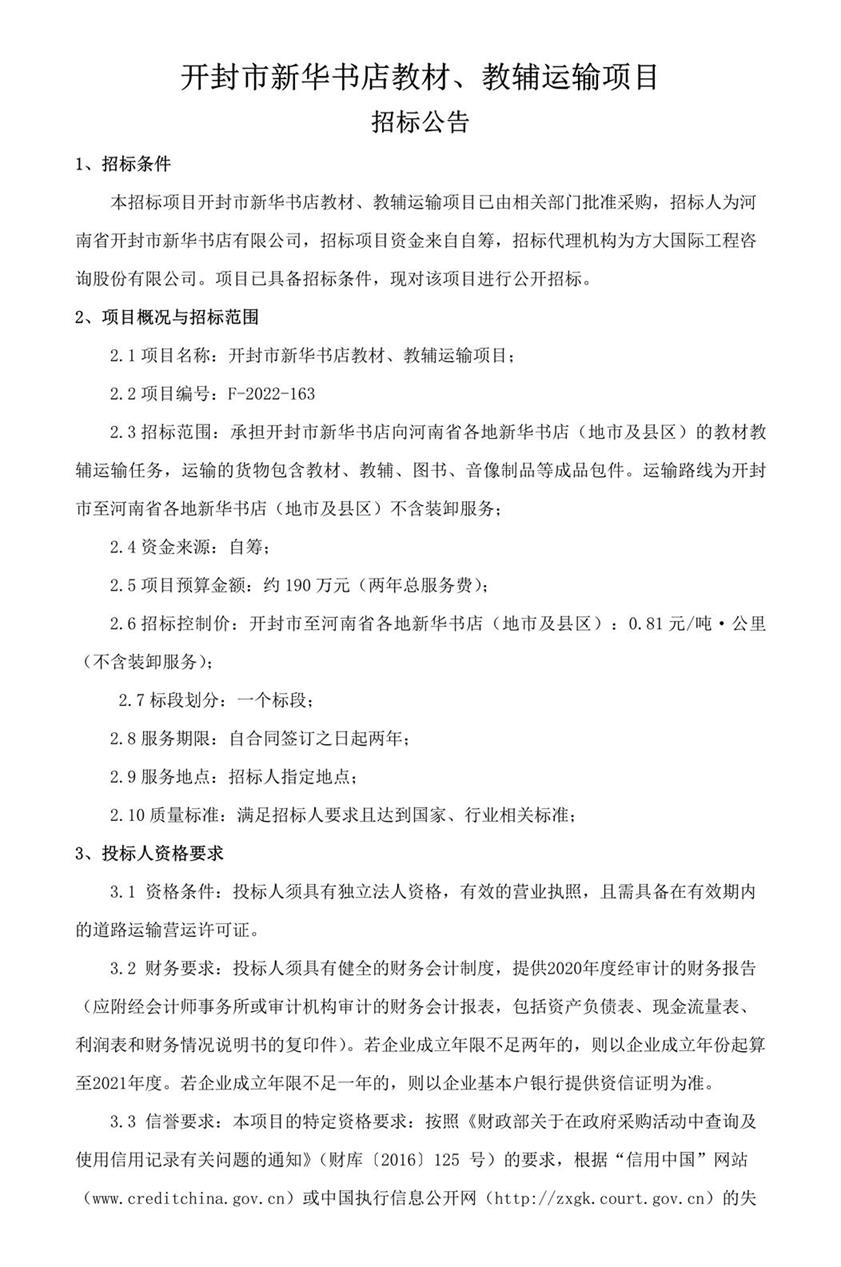 開封市新華書店教材、教輔運(yùn)輸項(xiàng)目招標(biāo)公告